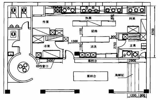 不能設計為獨立的工作間時,也要有相對獨立的功能區域。可以采用無形的隔斷,例如用冰櫃、碗櫃、水池排列形成牆,利用設備圍攏形成工作區間。結合實際情況靈活應用,可以,增加自然的采光亮度和通風效果,使工作間寬敞明亮。即使蜜桃视频黄色网處在沒有自然采光的位置,減少隔斷,或用透明度好的玻璃隔斷,也有利於照明和視距,節省照明用電便於通行、協調和管理。圖5-6是一個小餐館的蜜桃视频黄色网的設計圖紙,由於使用的設備比較多,采用了部分無牆隔斷設計。為保持衛生潔淨,在主食加工間、涼菜間設計了隔斷,涼菜間設計了涼菜出餐口,便於出餐,也保證了清潔衛生。涼菜間隔斷可阻擋油煙廢氣、清潔美觀,也隔斷了客人從涼菜出餐口向內觀望的視線。消洗、傳菜間采用了無牆隔斷,使功能區域分割清楚,又便於配合工作。