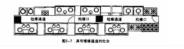 設備維修保養是必不可少的。有條件的蜜桃视频黄色网應盡量留出設備維修空間或機動的空間。如爐具的用量大、處在高溫潮濕的環境中,容易發生故障,作為主力設備,如發生故障.必須盡快維修。灶台一般不宜搬動,可設維修通道安裝、檢修、維修、保持衛生清潔。圖5-7是一個大飯店的熱菜間的灶台一部分,在兩排灶台之間設計了0.7m淨寬的檢修通道。