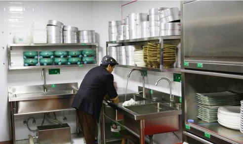 2、洗碗間的位置設施還應處理好廢棄物、汙染物等垃圾的存、運問題。在洗滌消毒的過程中,一方麵又餐具進入,另一方麵,又有潔淨餐具送出。所以其潔、汙流線分流明確,無迂回交叉的位置是合理的。反之,即為不合理的。