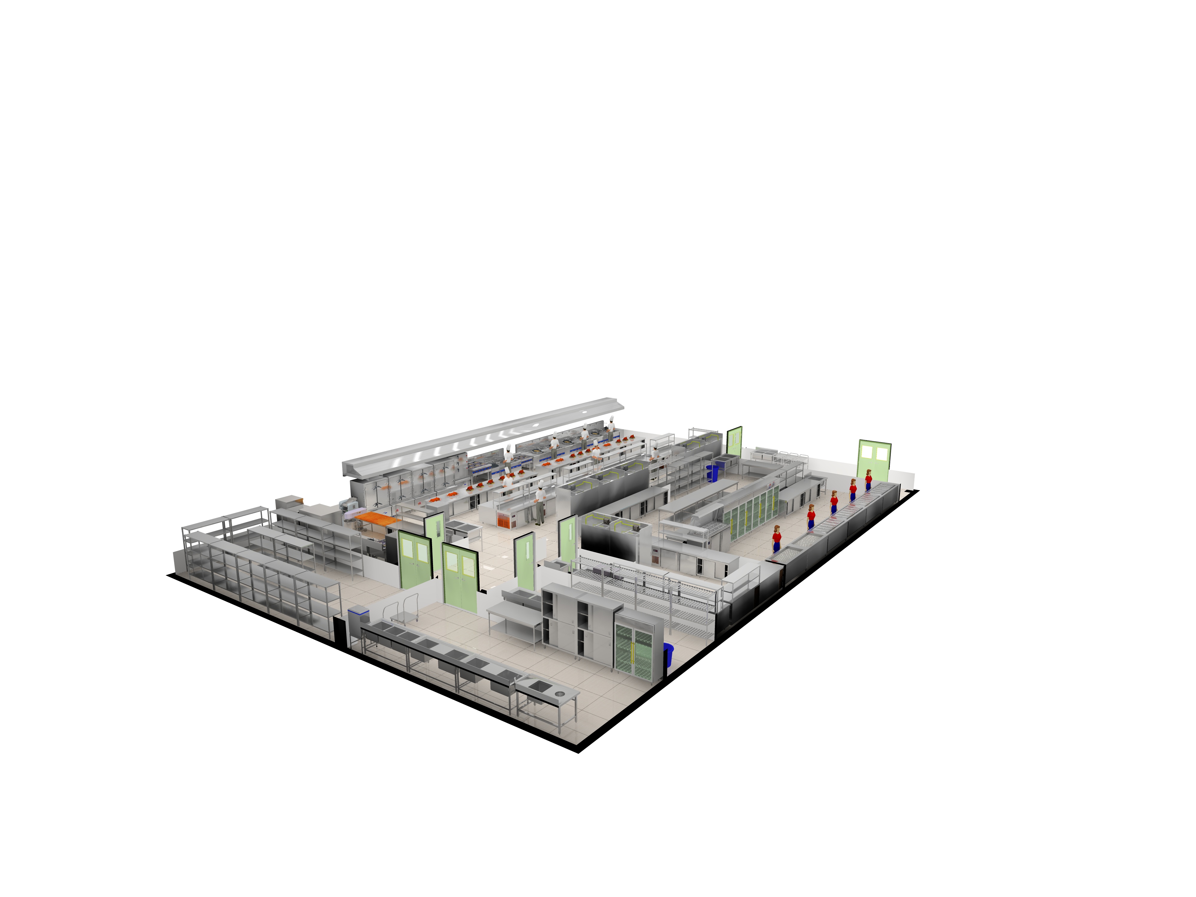 4. 設備布局與通道銜接簡捷順暢:設備之間由通道連接,傳菜通道要有足夠的寬度。設備布 局與通道銜接要簡捷順暢。較大的主灶間要設專用的進出口,分開進出運行路線。