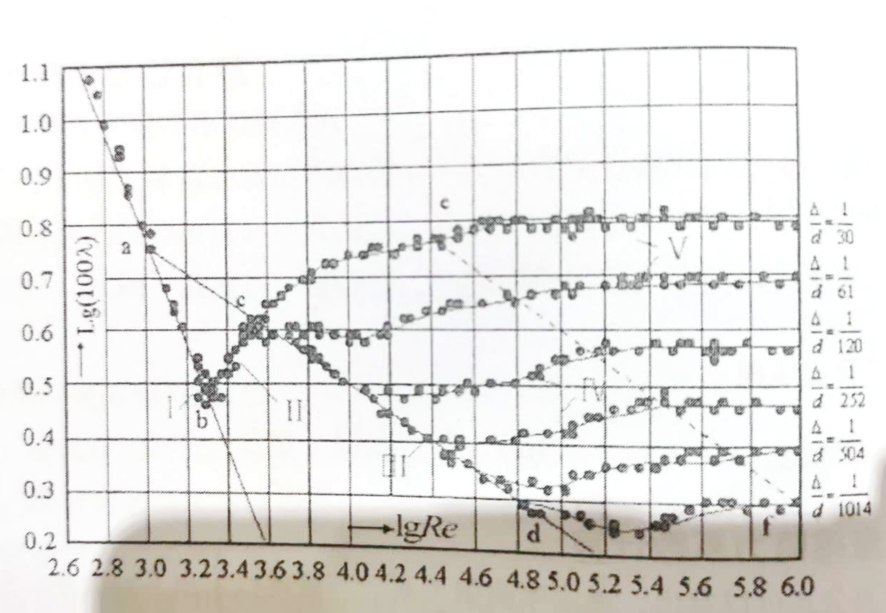 IV區:紊流過渡區。隨著雷諾數的增大,各種不同粗糙度的曲線開始離開cd曲線,摩擦阻力係數逐漸增大,當增加至圖中虛線位置時各曲線開始與lgRe軸平行。在cd線與虛線中間的區域為第Ⅳ區。該區摩擦阻力係數可用柯列勃洛克公式計算。