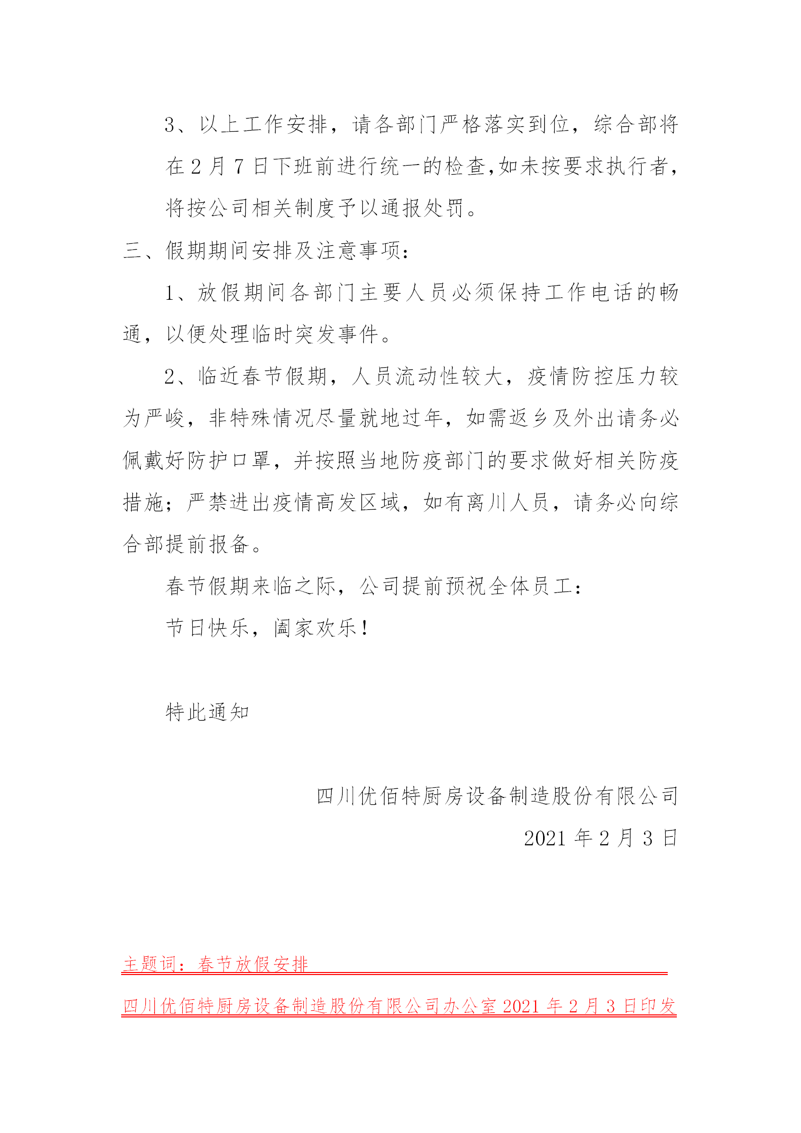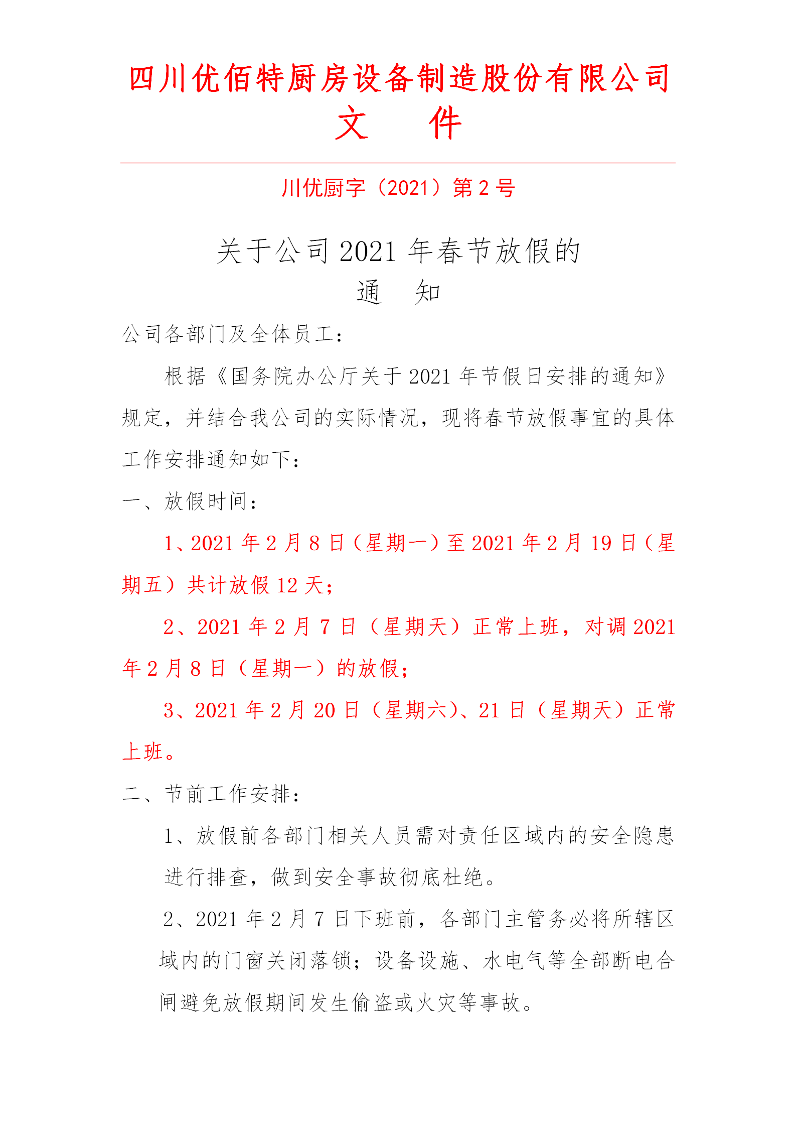 感謝你這一年來對四川蜜桃视频APP下载网站蜜桃视频黄色网設備製造股份有限公司的支持,春節假期將至,蜜桃视频APP下载网站公司祝你和你的家人新春快樂,財源廣進,萬事如意。我公司根據《國務院辦公廳關於2021年節假日安排通知》,並結合我公司實際情況,對春節放假做出如下安排: