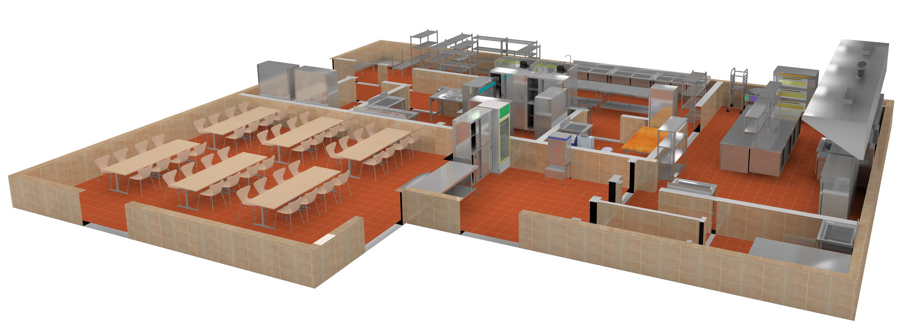主要炒菜區為L形布局,根據需要設置打荷台與切配工作台、保證主要炒菜灶的工作需要。