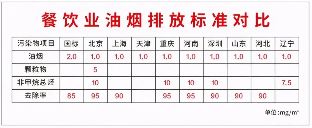在我國對油煙排放有著嚴格的限製,國標《飲食業油煙排放標準(GB18483-2001)》規定,油煙排放濃度不得超過2.0mg/m3,相應淨化係統的淨化效率大型係統不得低於85%,中型係統不得低於75%,小型係統不得低於60%。