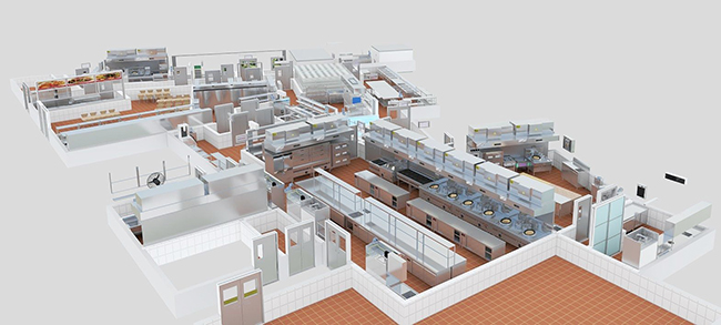 7、設計務必了解主廚的加工工藝,依據主廚工作中的必須配備設備,設計實際操作室內空間、近遠尺寸要適合舒適。比如,刀功上料、洗涮、配菜、醃醬、擺盤、傳送、清除案麵都必須在有效的範疇內配備設備,這就必須使冷藏、操作台、蓄水池、碗架等幾類設備配搭應用,間距很遠應用不方便,就會混日子,耗費精力,減少工高效率。