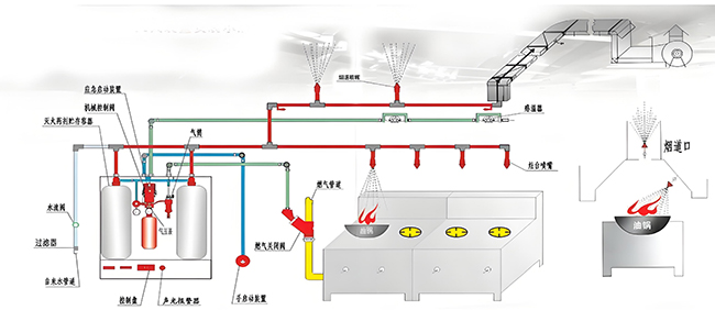 3、蜜桃视频黄色网專用滅火裝置:蜜桃视频黄色网專用滅火裝置是由滅火劑儲瓶與關斷燃料閥機構、機械驅動裝置、霧化與噴頭管網、感溫易熔金屬探測器與控製管路、手動應急啟動等組成。蜜桃视频黄色网安裝該係統之後,可24小時不間斷的對蜜桃视频黄色网的灶台、集油煙罩、排煙管道進行全方位的消防保護。