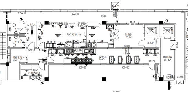 備餐區→涼菜間→蜜桃视频黄色网粗加工區→蜜桃视频黄色网熱加工區→排出空外