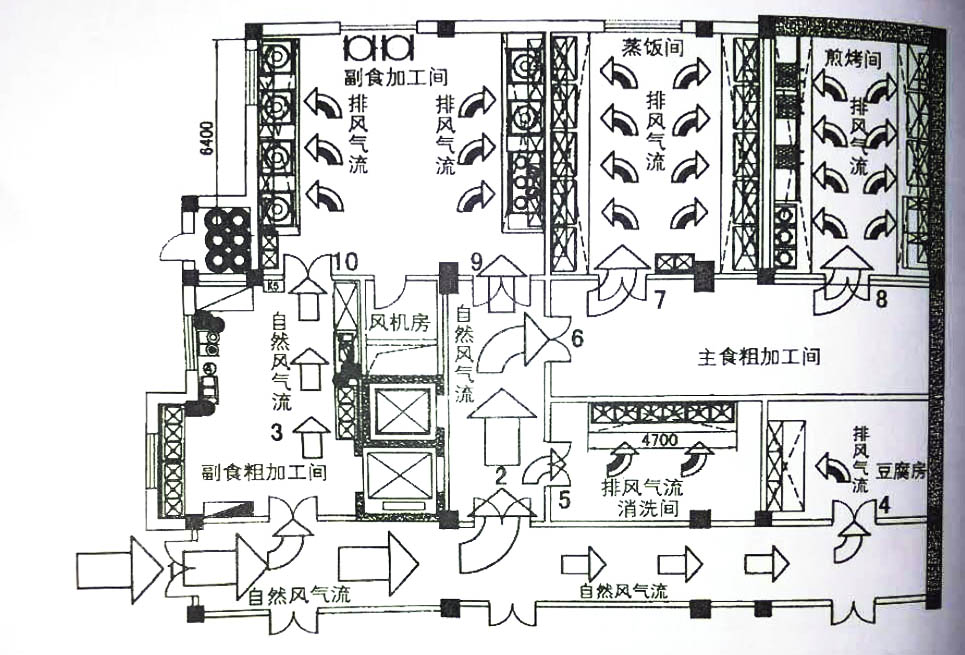 首先,圖一是一個學校食堂的半地下蜜桃视频黄色网,售飯區和明檔在二、三層,傳菜收殘全部用傳菜梯,蜜桃视频黄色网有一個出入口1號門。由於不補充新風,負壓太大,主食加工的蒸飯間和前烤間出入口7號、8號門關門後就很難打開,此時,下水道的汙氣、汙水回流。